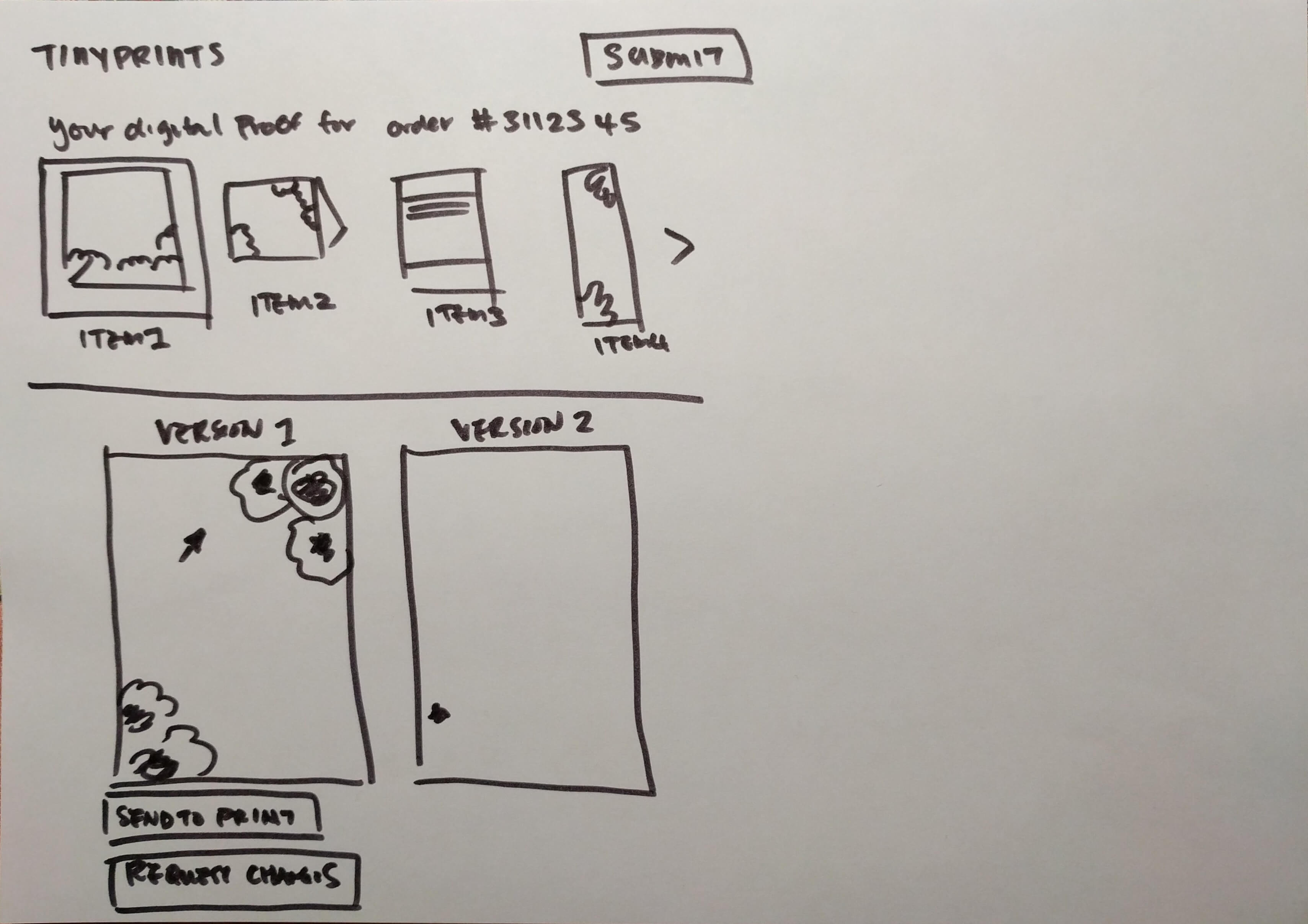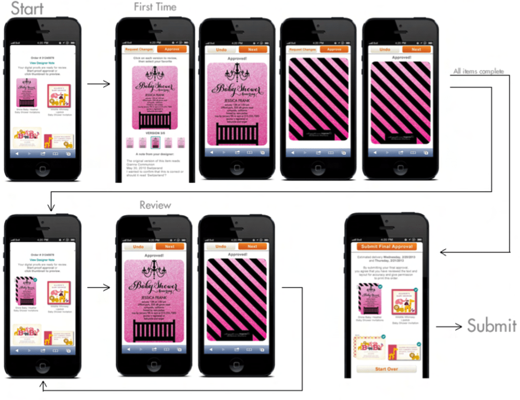 The ‘hub’ will show a thumbnail of all of the items in the order, and it is also where a user starts their proofing process. The ‘spoke’ is each individual item. Once a user has chosen either ‘approve’ or ‘request changes’ on each of the panel in the item, the user is taken back to the ‘hub’ to see the confirmation of their selection and to start on the next item.